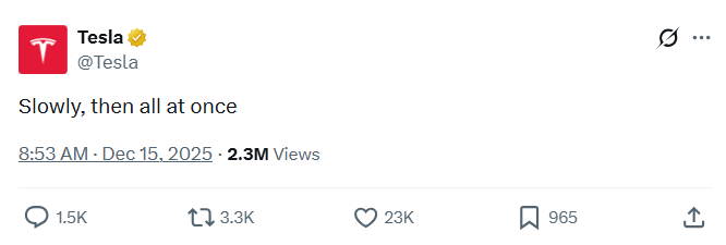 一边是万亿市值的诱惑,另一边是Waymo等巨头的铜墙铁壁,脚下则是容不得半点差错的安全红线。X上的那句“Slowly, then all at once”,既可以是成功的预言,也可以是危机的隐喻。