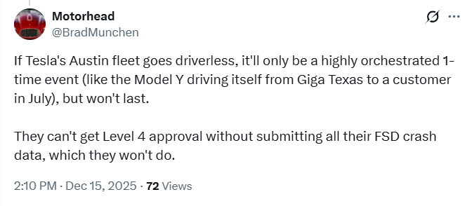 相比之下,特斯拉在奥斯汀的车队规模简直可以用“寒酸”来形容。截至今年10月,特斯拉在当地仅有约30辆车。虽然马斯克承诺年底前翻倍至60辆,但在Waymo的庞大队伍面前,依然就像是散兵游勇面对正规军。