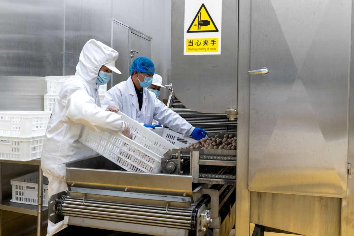 走进这座总投资超过2亿元建成的现代化工厂,恒温恒湿十万级洁净车间内,智能化生产线上,一块块经过严格检疫的新鲜有机牦牛肉,通过去骨、去油、剔筋膜等精细流程后,在精准的温控下,经过打浆、定型、熟化和风冷等自动化流程,变身为一颗颗“Q弹”的牦牛肉丸。